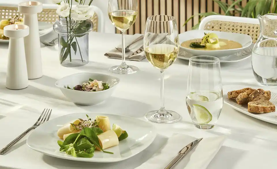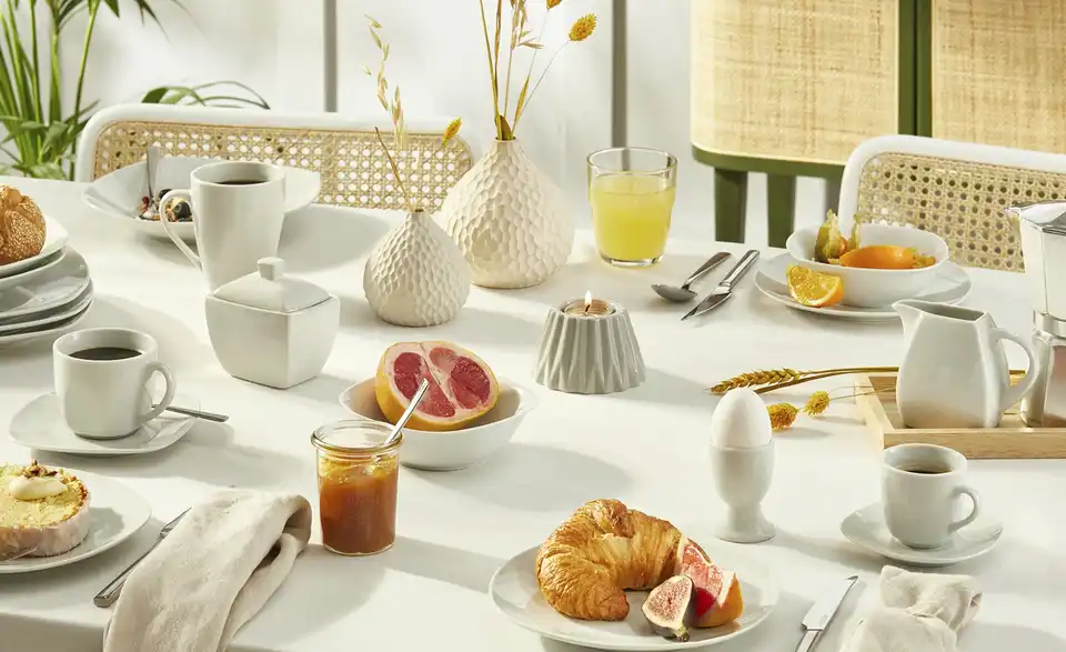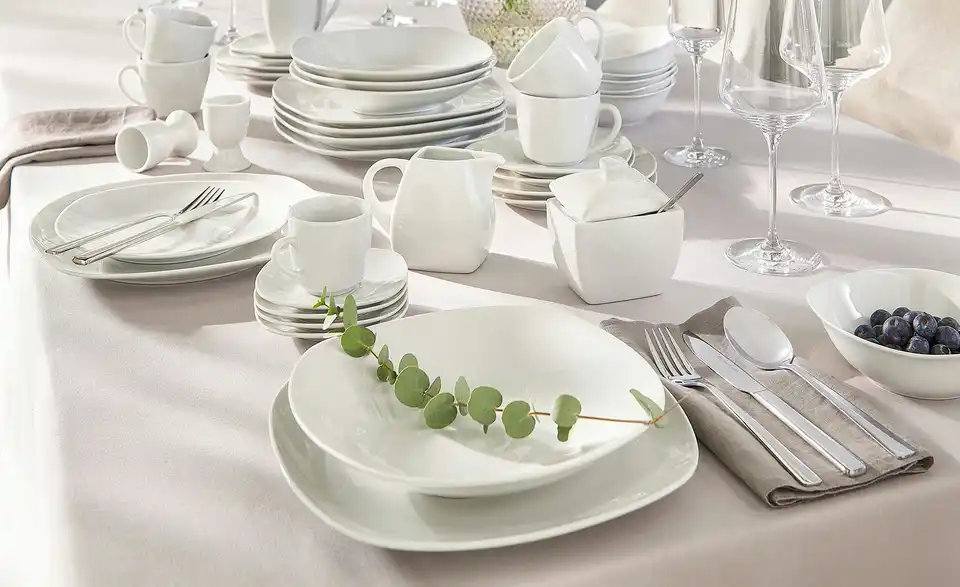 Ob beim Frühstück mit der Familie, dem Kaffeeklatsch mit Freunden oder beim Espresso zwischendurch – ohne Geschirr isst und trinkt es sich nur halb so gut. Das Kombiservice Tivoli bietet Ihnen mit seinen 62 Teilen alles, was Sie brauchen. Neben Kaffeetassen und –bechern, Espressotassen und den dazugehörigen Untertellern und Desserttellern, gehören dazu auch tiefe und flache Teller und Eierbecher. Auch eine Zuckerdose und ein Milchkännchen gehören zu dem Service. Das gesamte Geschirr besteht aus Porzellan. Das Service ist in einem neutralen und stilvollen Weiß gehalten und wirkt sehr modern. Denn wie so schön gesagt wird: das Auge isst mit. Wir wünschen guten Appetit.Lieferung & Versand