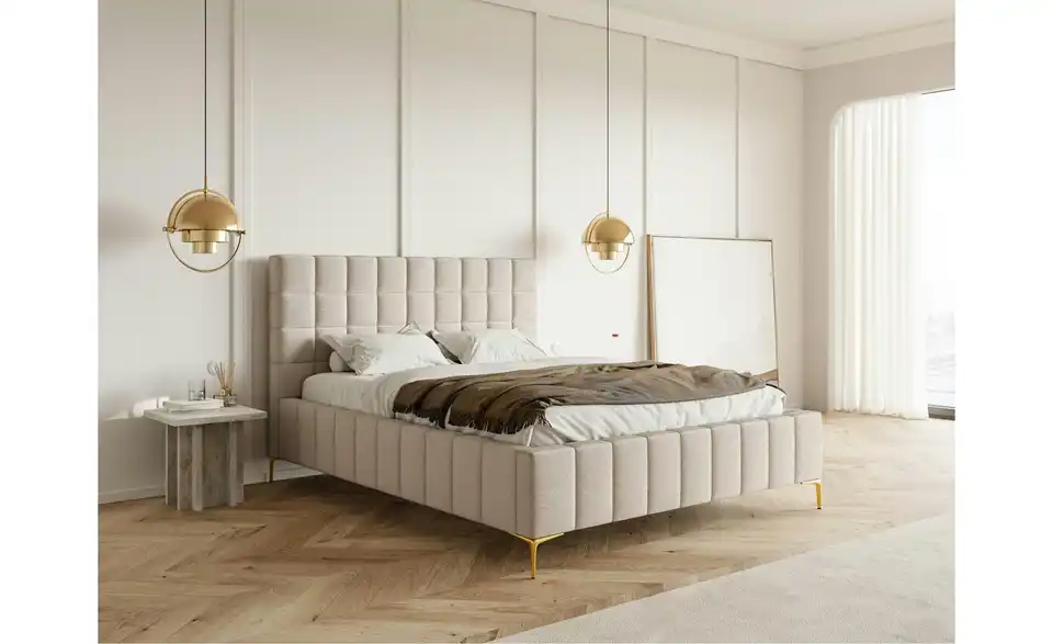 Das Polsterbett Szejlo vereint Stil, Komfort und praktische Funktionen. Mit seinem edlen Design, geprägt von rechteckigen Steppungen am weichen Kopfteil und Bettrahmen, bringt das Doppelbett Szejlo Eleganz in Ihr Schlafzimmer. Die 15 cm hohen, goldfarbenen Füße verleihen dem Bett eine leichte und schwebende Optik, während der robuste Bezug aus Chenille-Stoff mit seiner geflochtenen Struktur langlebig, lichtbeständig und abriebfest ist. Das Bett bietet nicht nur Design, sondern auch Funktionalität: Der geräumige Bettkasten ermöglicht eine aufgeräumte Aufbewahrung von Bettwäsche, Decken und mehr. Dank der Gasdruckfedern lässt sich der Metall-Lattenrost mühelos anheben, sodass der Stauraum leicht zugänglich ist. Mit Szejlo holen Sie sich modernes Design und hohen Komfort in Ihr Schlafzimmer – perfekt für ein glamouröses Ambiente.Lieferung & Versand