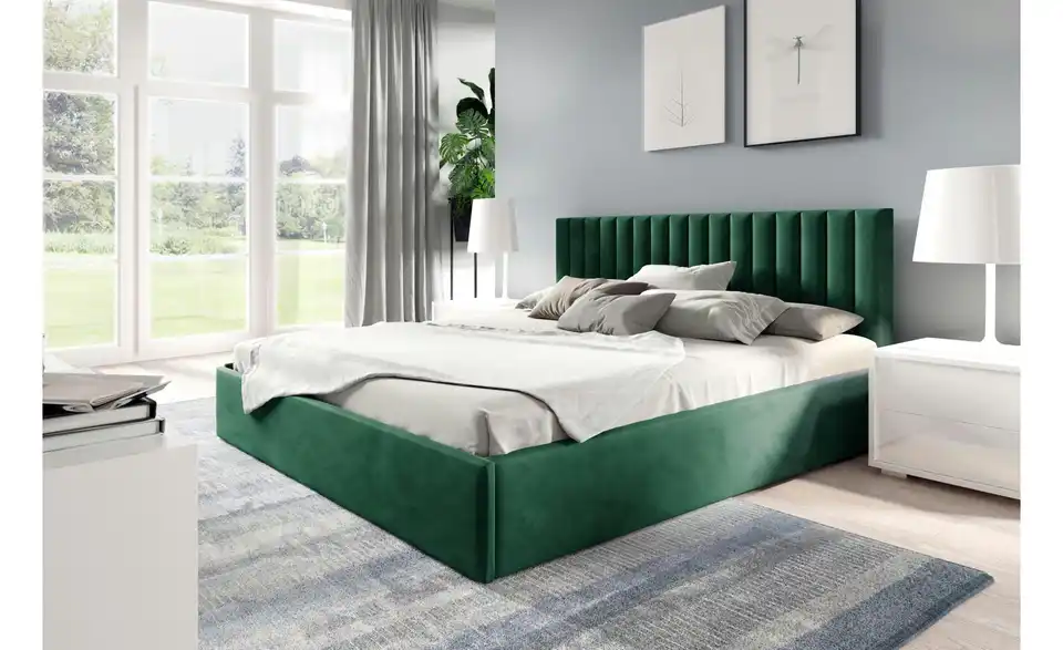 - Ausstattung / FunktionBettkastenöffnung am Fußteilinnen liegender Bettkastenmit GasdruckfederKopfteil rundherum bezogen