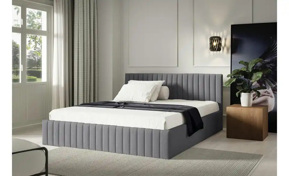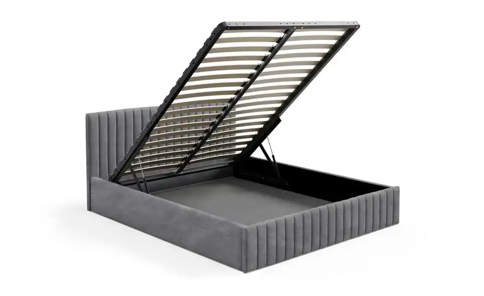 - Ausstattung / FunktionBettkastenöffnung am Fußteilinnen liegender Bettkastenmit GasdruckfederKopfteil rundherum bezogen