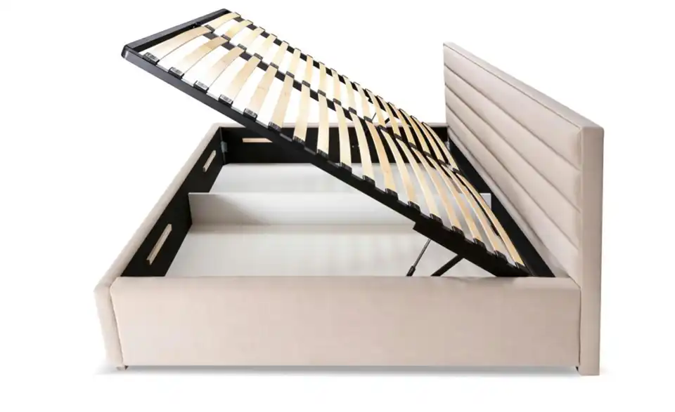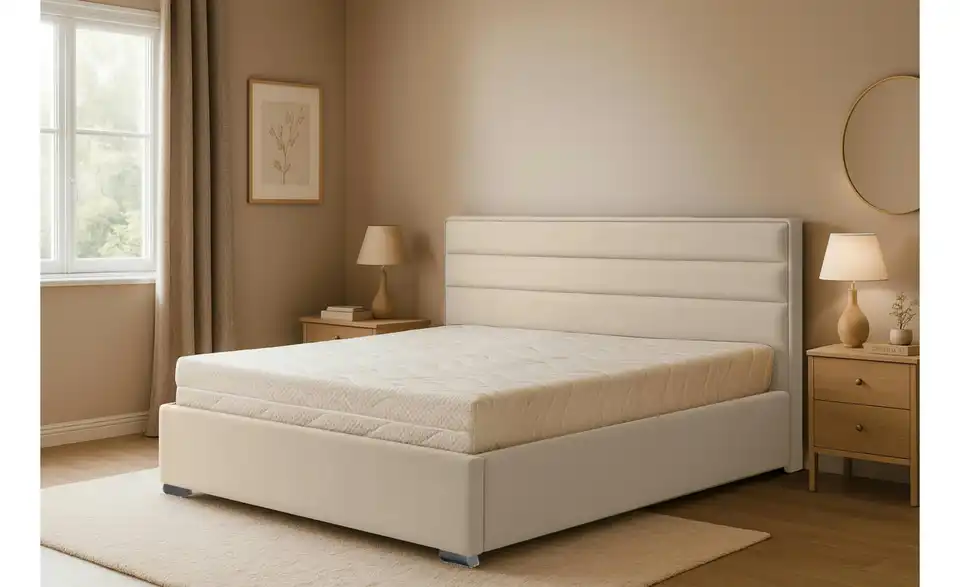 - Ausstattung / FunktionBettkastenöffnung linksBettkastenöffnung rechtsinnen liegender Bettkastenmit GasdruckfederKopfteil rundherum bezogen