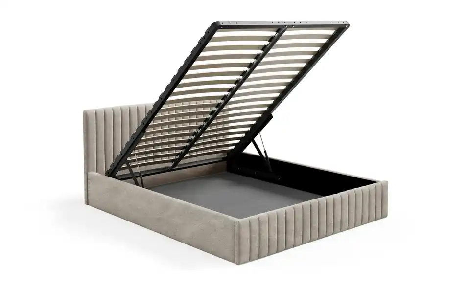 - Ausstattung / FunktionBettkastenöffnung am Fußteilinnen liegender Bettkastenmit GasdruckfederKopfteil rundherum bezogen