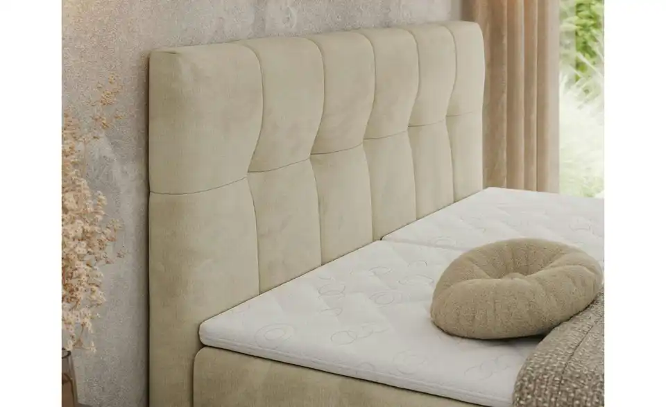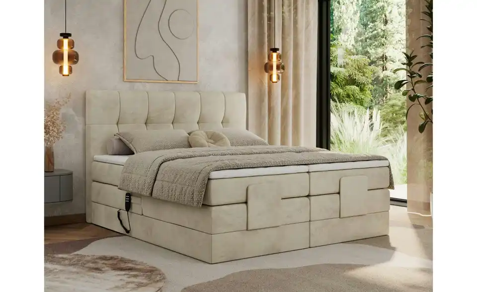 - Lieferumfang / mitgeliefertes ZubehörCremefarbenes Motor-Boxspringbett mit Bettkasten 180x200 cm