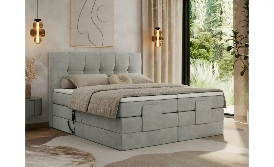 - Lieferumfang / mitgeliefertes ZubehörHellgraues Motor-Boxspringbett mit Bettkasten 180x200 cm