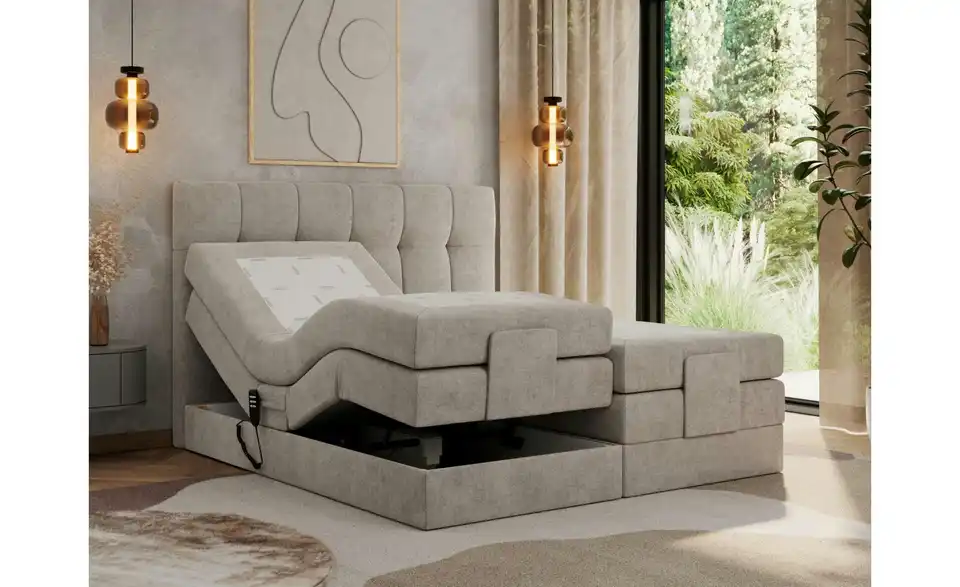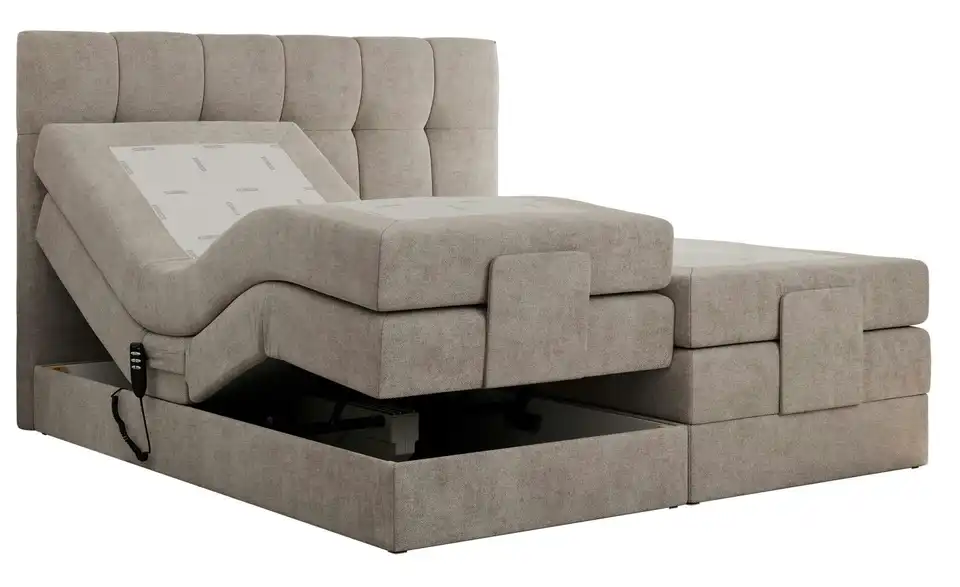 - Lieferumfang / mitgeliefertes ZubehörBeiges Motor-Boxspringbett mit Bettkasten 200x200 cm
