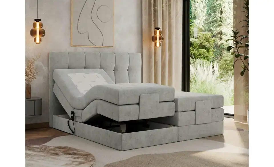 - Lieferumfang / mitgeliefertes ZubehörHellgraues Motor-Boxspringbett mit Bettkasten 160x200 cm