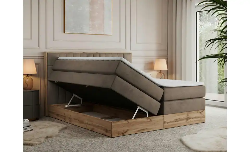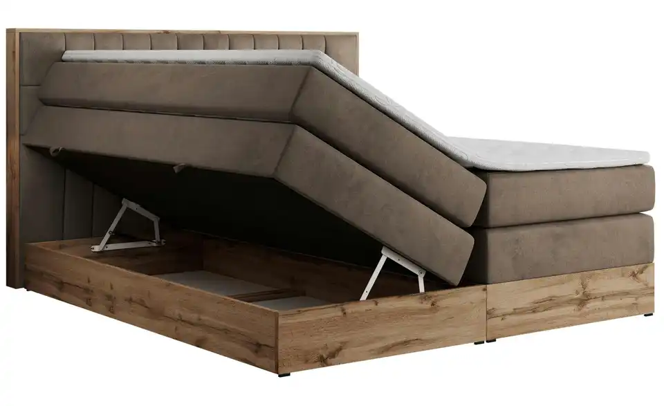 - Lieferumfang / mitgeliefertes ZubehörBronzefarbenes Boxspringbett mit Bettkasten 140x200 cm