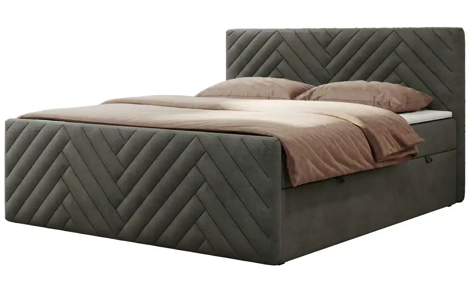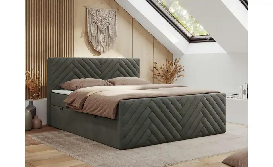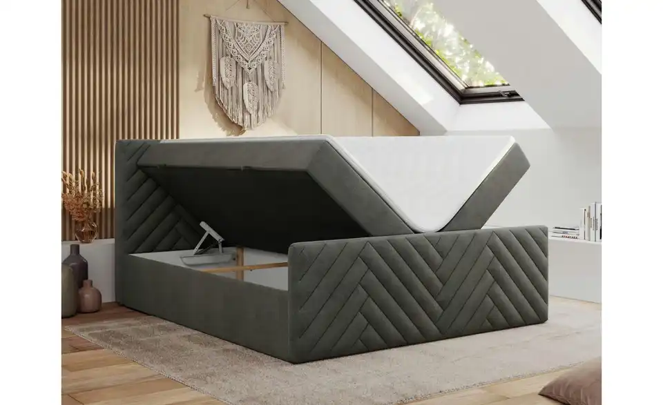 - Lieferumfang / mitgeliefertes ZubehörBasaltgraues Polsterbett mit Bettkasten 140x200 cm