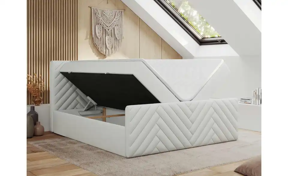 - Lieferumfang / mitgeliefertes ZubehörWeißes Polsterbett mit Bettkasten 200x200 cm