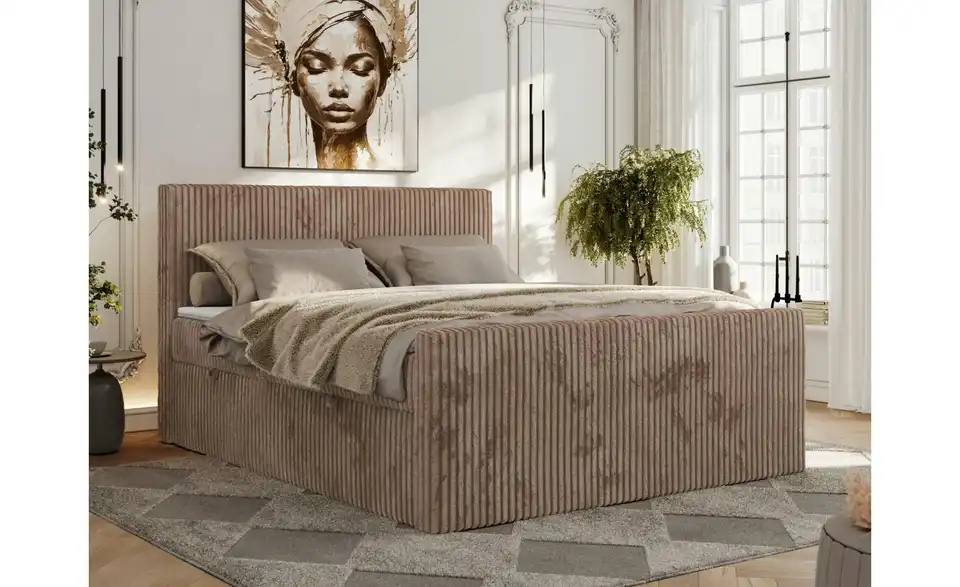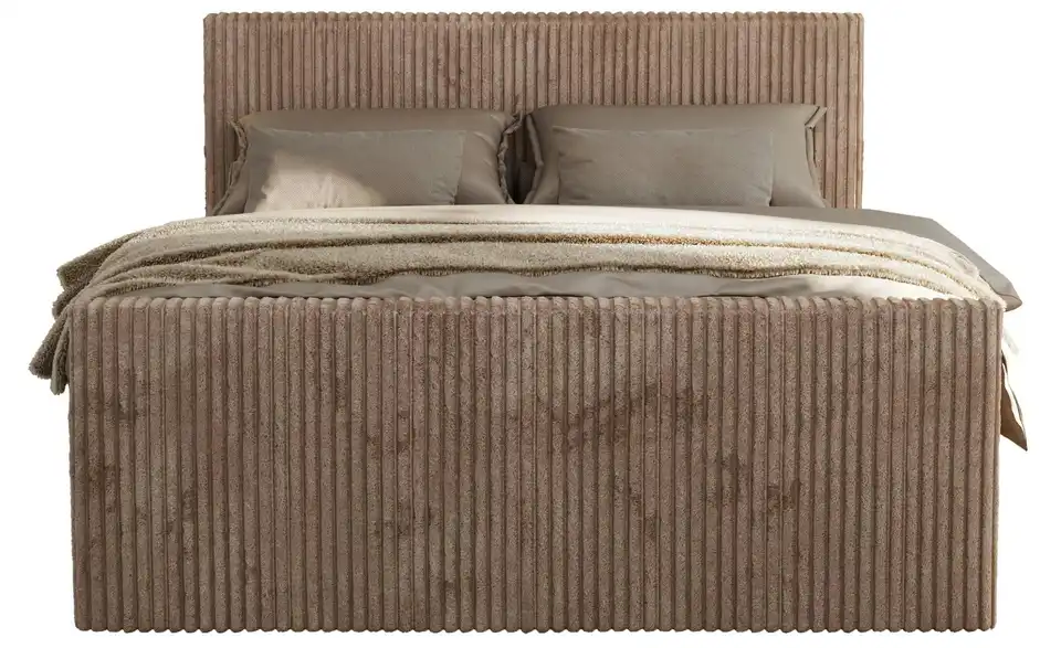 - Lieferumfang / mitgeliefertes ZubehörTaupefarbenes Polsterbett mit Bettkasten 160x200 cm