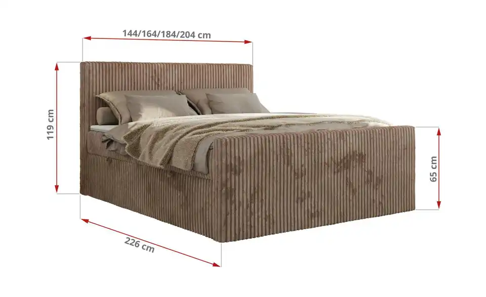 - Lieferumfang / mitgeliefertes ZubehörTaupefarbenes Polsterbett mit Bettkasten 200x200 cm
