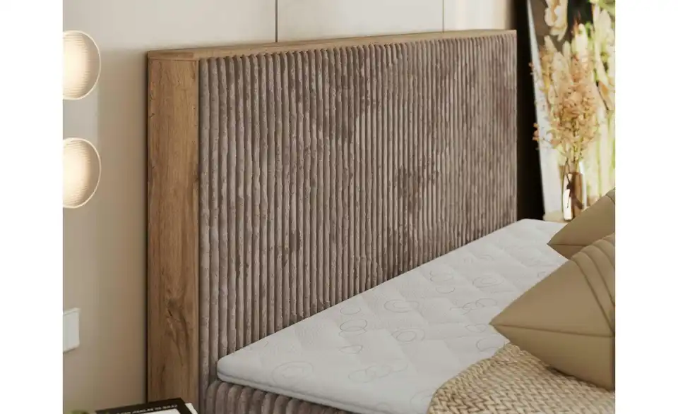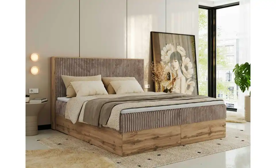 - Lieferumfang / mitgeliefertes ZubehörTaupefarbenes Polsterbett mit Bettkasten 160x200 cm