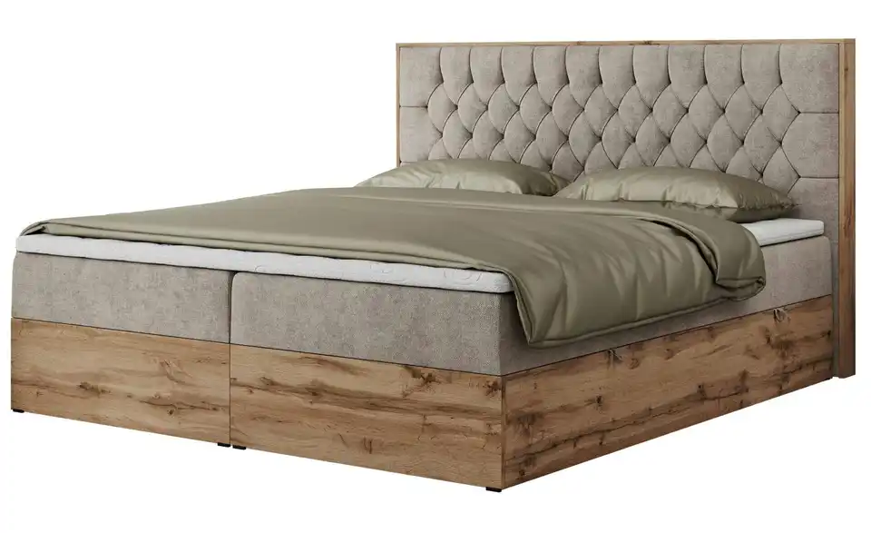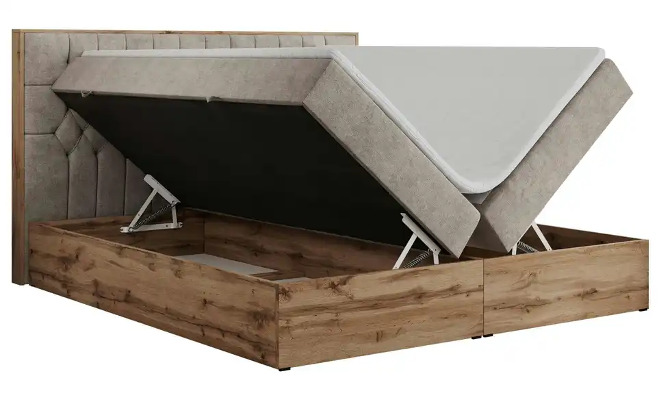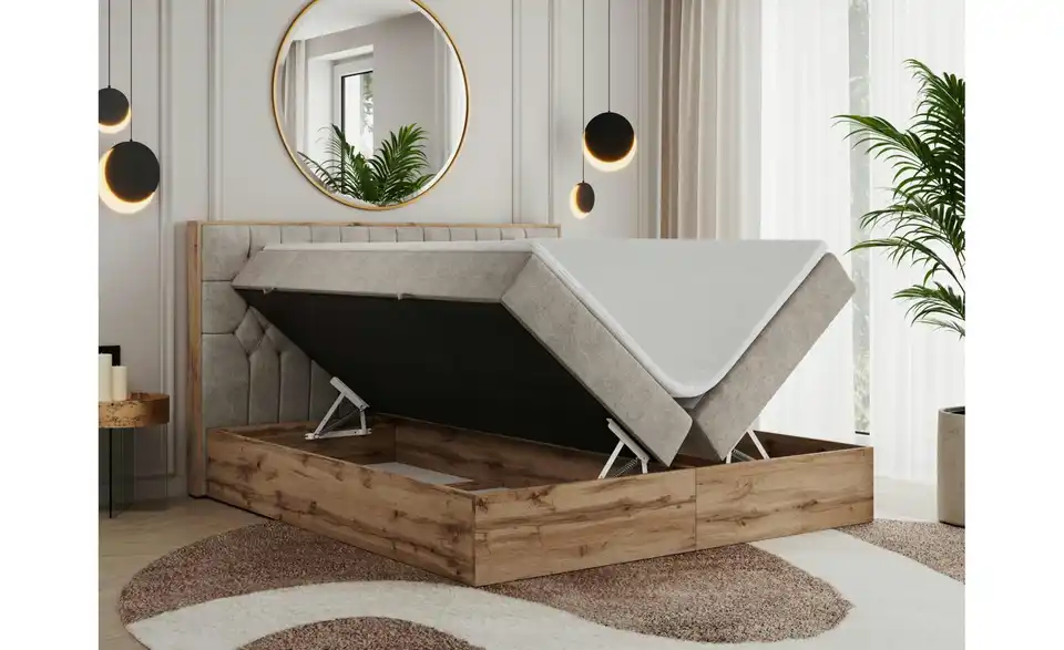 - Lieferumfang / mitgeliefertes ZubehörBeiges Polsterbett mit Bettkasten 180x200 cm