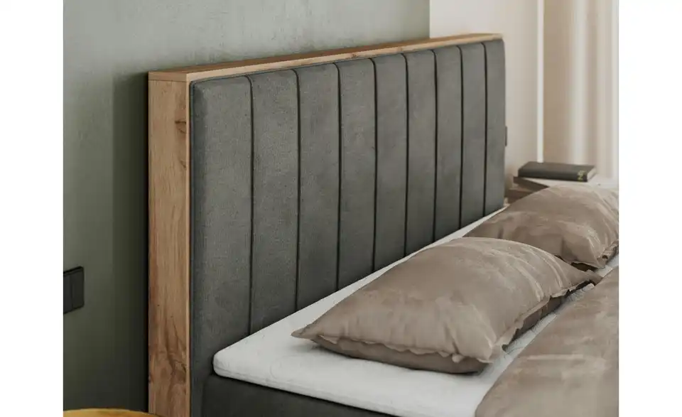 - Lieferumfang / mitgeliefertes ZubehörBasaltgraues Polsterbett mit Bettkasten 140x200 cm