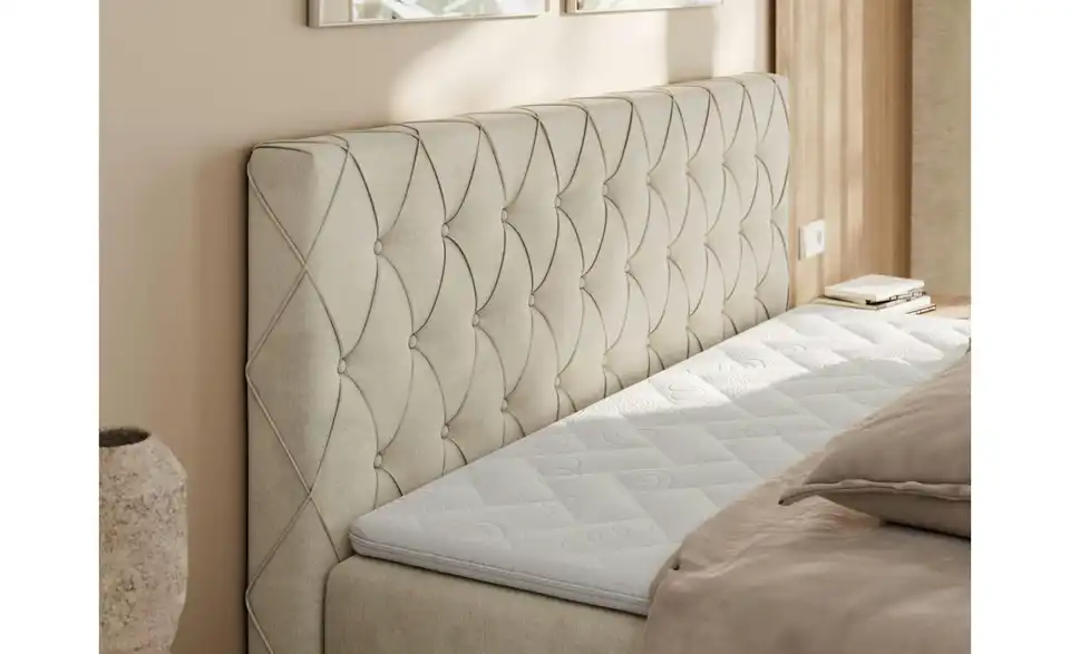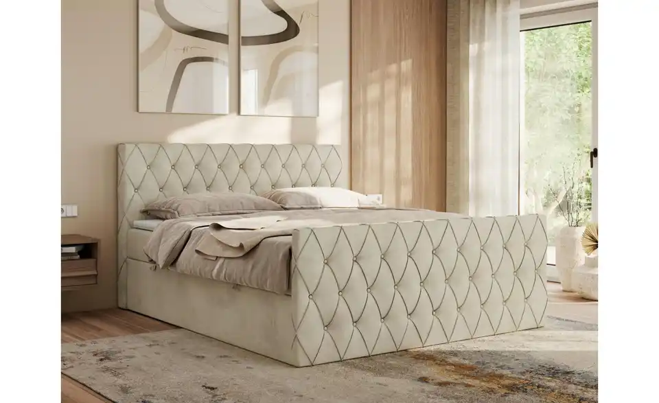 - Lieferumfang / mitgeliefertes ZubehörCremefarbenes Polsterbett mit Bettkasten 120x200 cm