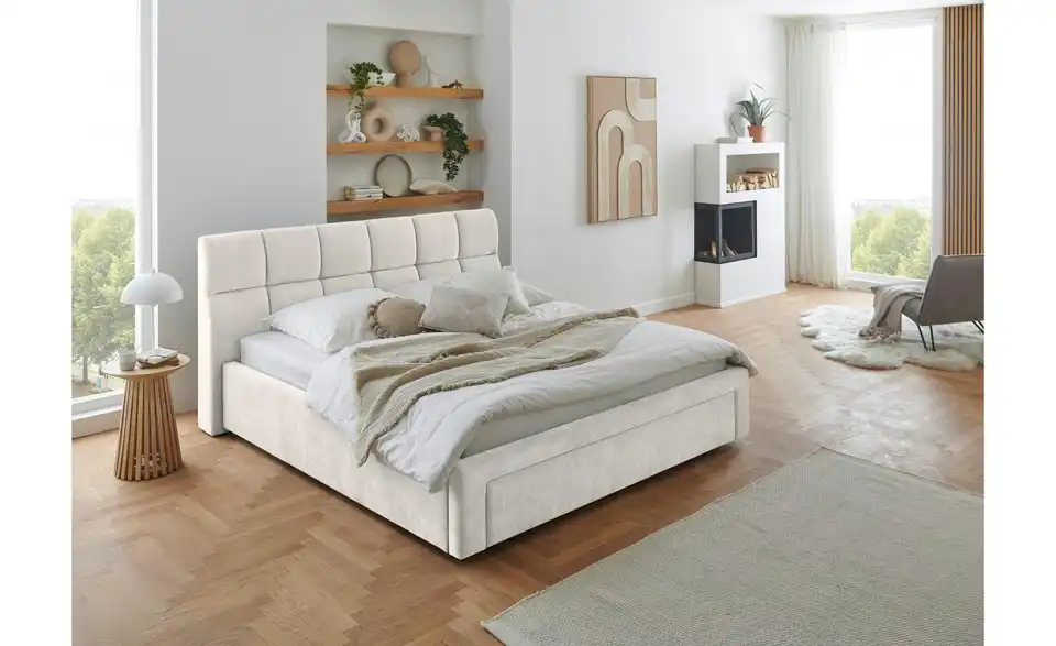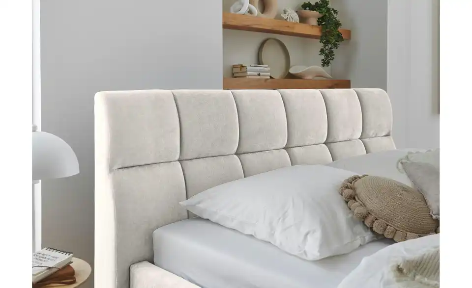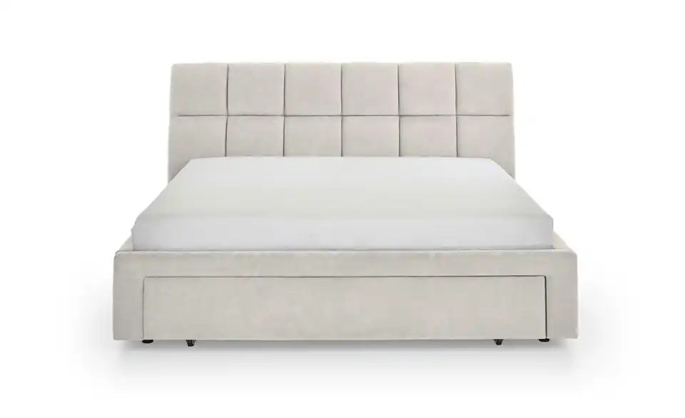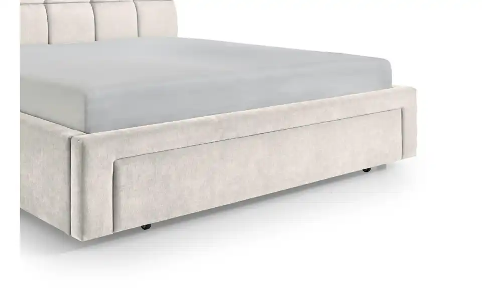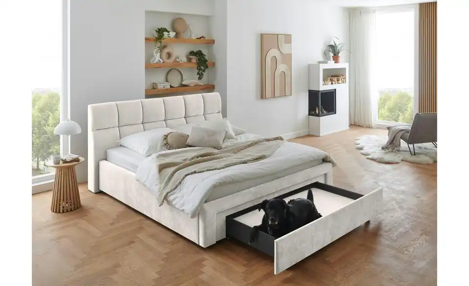 - Lieferumfang / mitgeliefertes ZubehörBeiges Polsterbett 180x200 cm mit Schubkasten inkl. Kissen für Hundebett