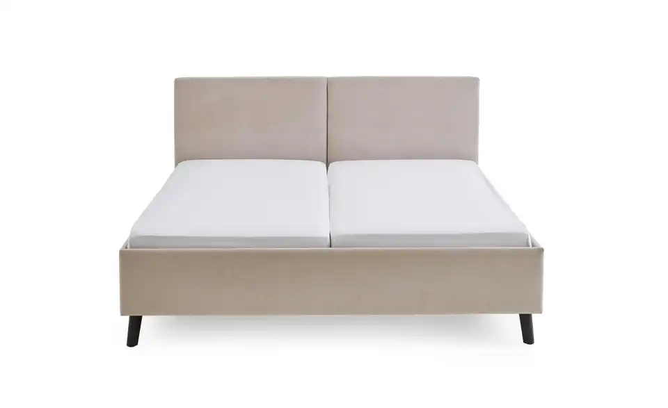 - Lieferumfang / mitgeliefertes ZubehörBeiges Polsterbett 160x200 cm mit Holzfüßen, schwarz