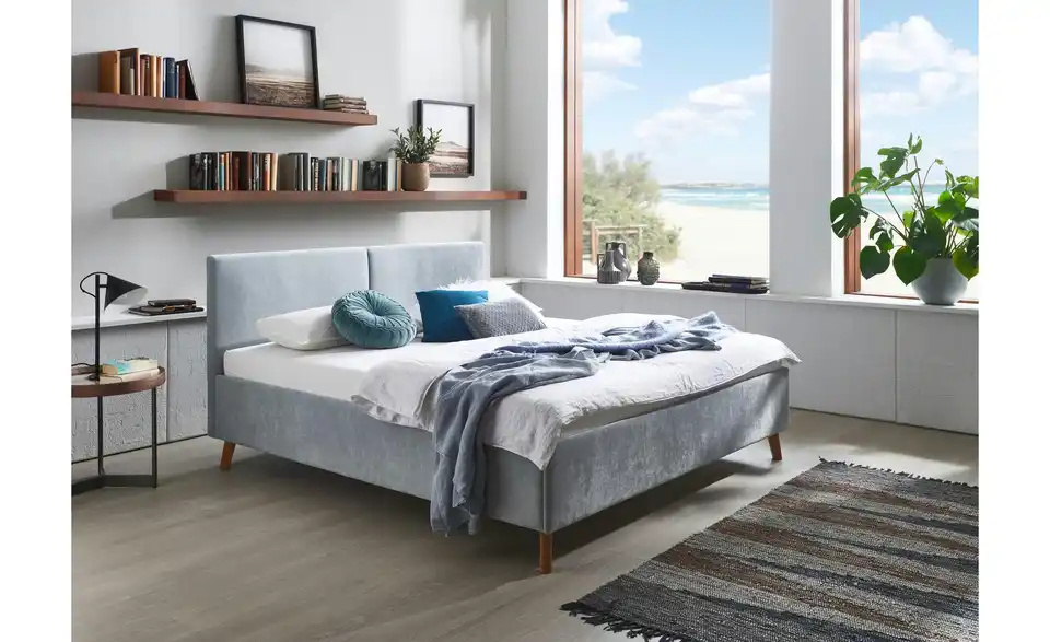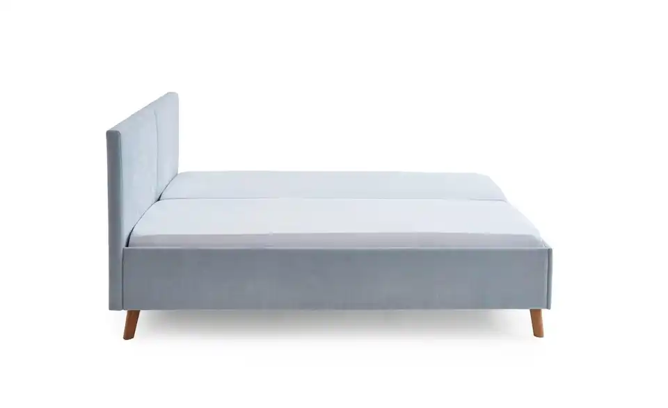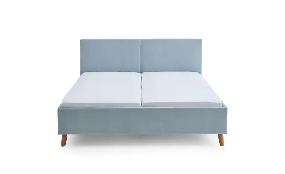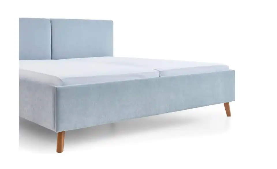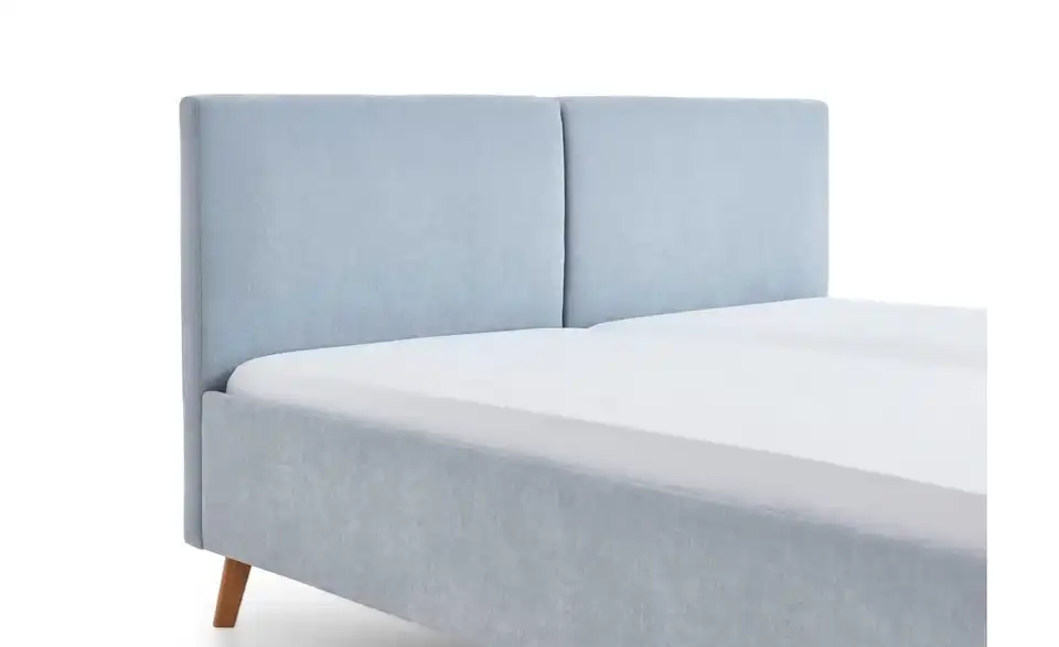 - Lieferumfang / mitgeliefertes ZubehörHellblaues Polsterbett 160x200 cm mit Holzfüßen, eichefarbig
