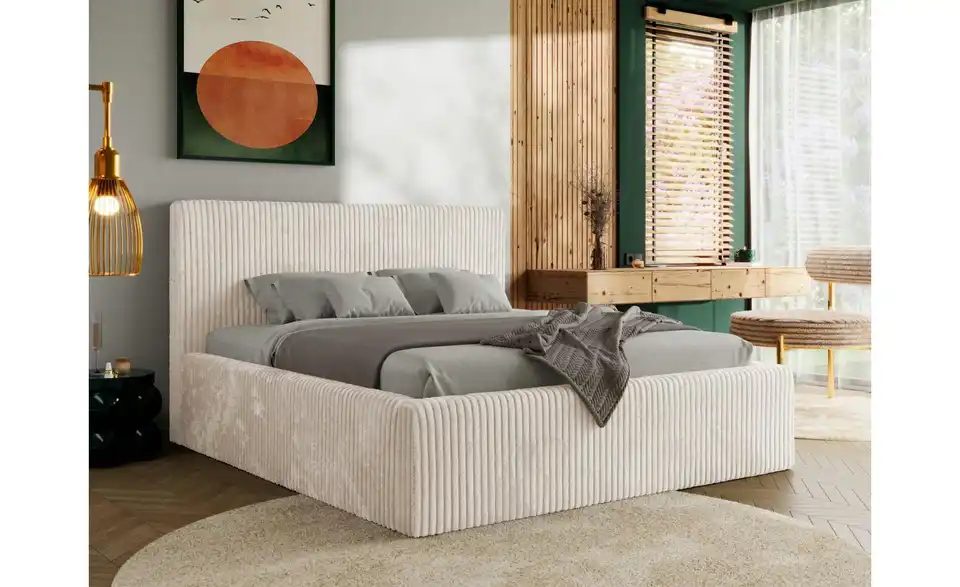 - Lieferumfang / mitgeliefertes ZubehörBeiges Polsterbett mit Bettkasten 180x200 cm