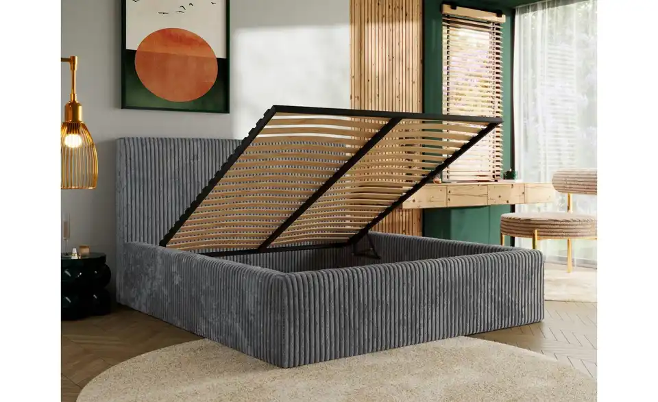 - Lieferumfang / mitgeliefertes ZubehörGraues Polsterbett mit Bettkasten 200x200 cm