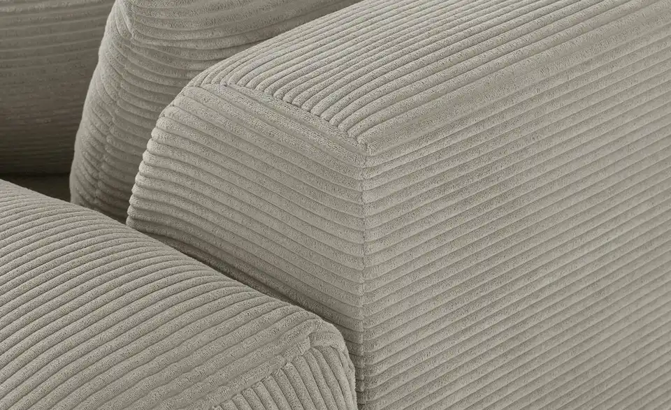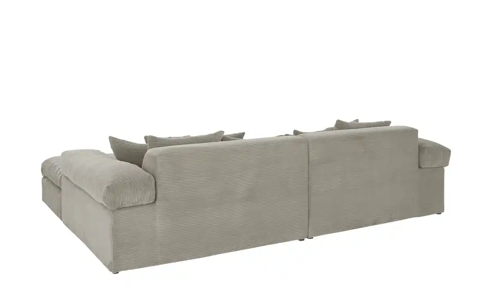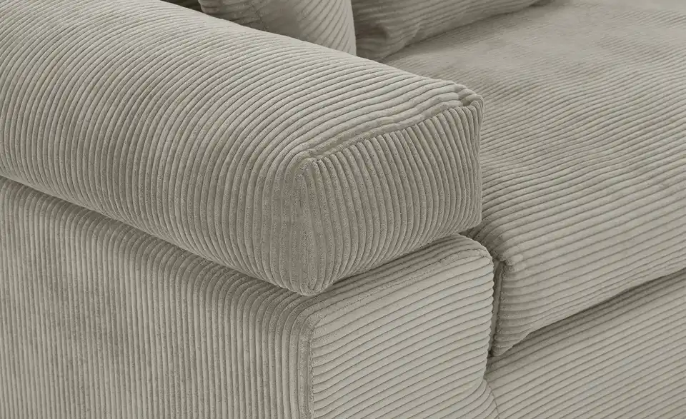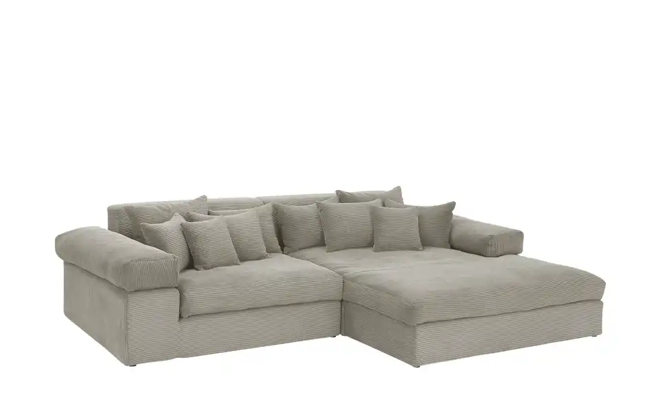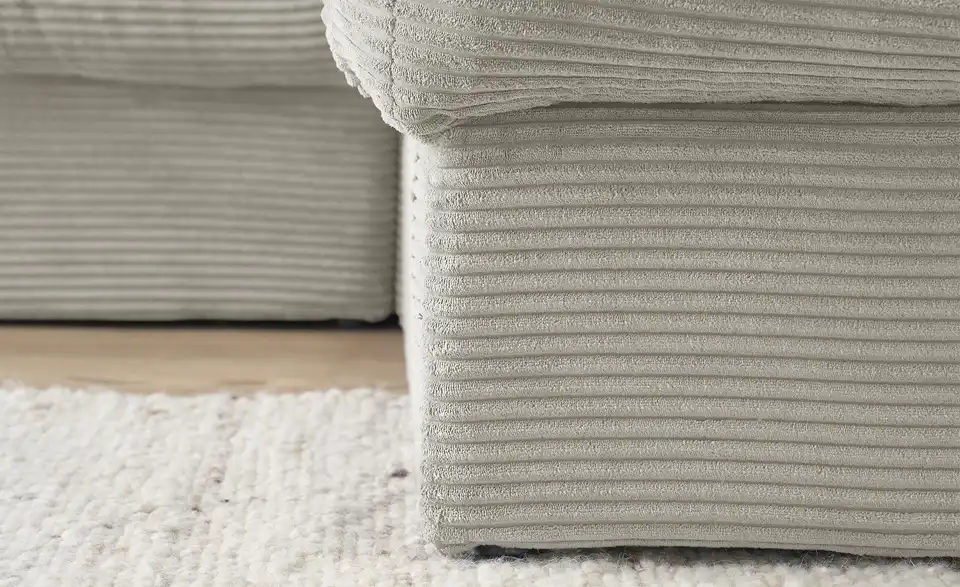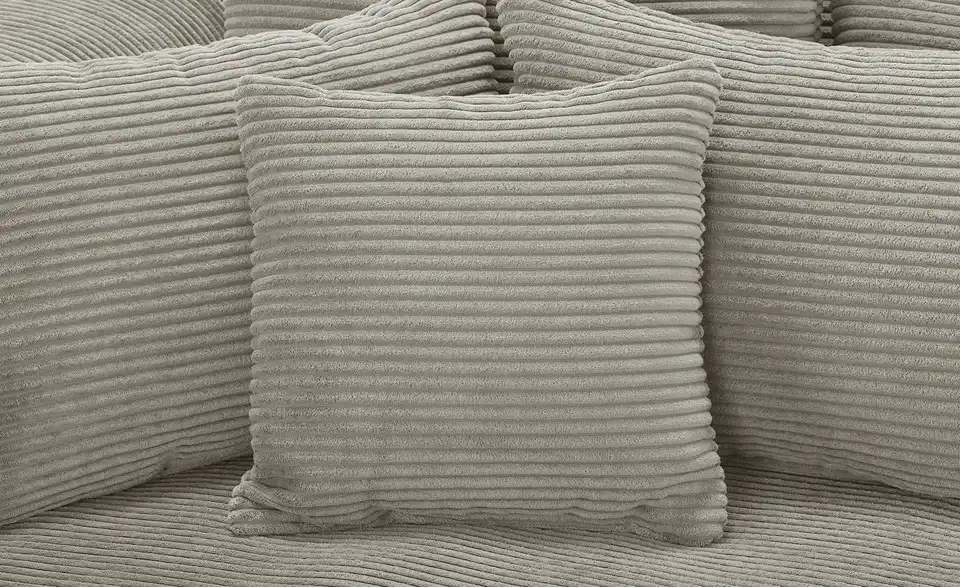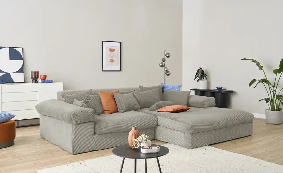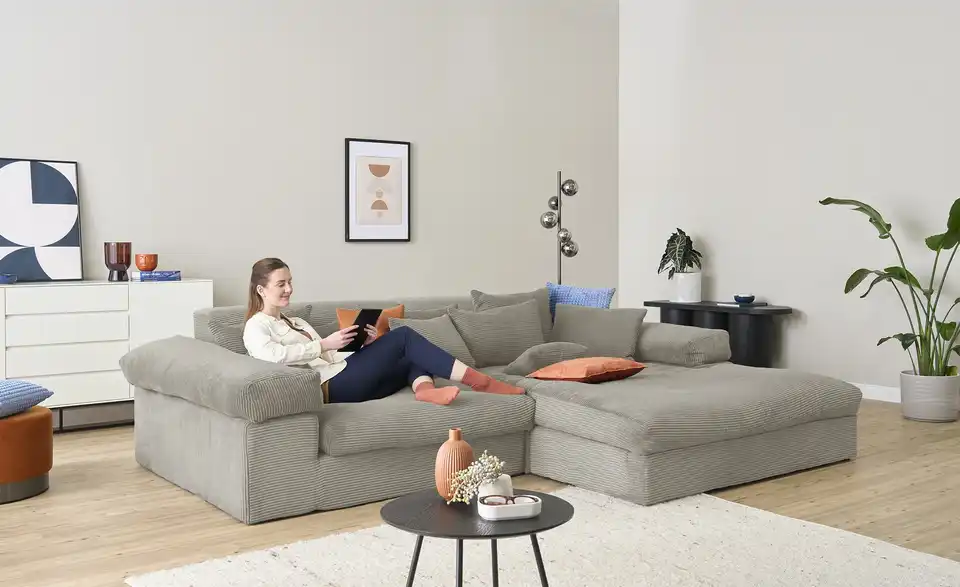 Dieses Ecksofa lädt mit seinen dicken Polsterkissen zum Entspannen ein. Zwölf Zierkissen, zwei breite Armlehnen und eine extra große Ottomane sorgen für ein Plus an Gemütlichkeit. Machen Sie es sich bequem und fügen Sie eigene Dekodecken und -Kissen hinzu. Der einfarbige Bezug ist kombinationsfreudig und sogar auf der Rückseite des Sofas zu finden. So können Sie das Ecksofa auch mittig im Raum oder von der Wand abgerückt platzieren. Entscheiden Sie sich nur noch für Ihre Lieblingsfarbe und wählen Sie zwischen trendigem Cord, kuschelweichem Chenille-Stoff und pflegeleichtem Webstoff.Lieferung & Versand