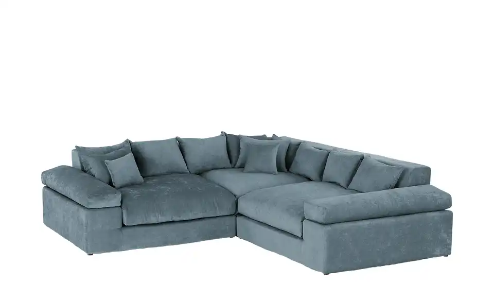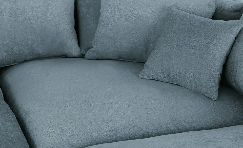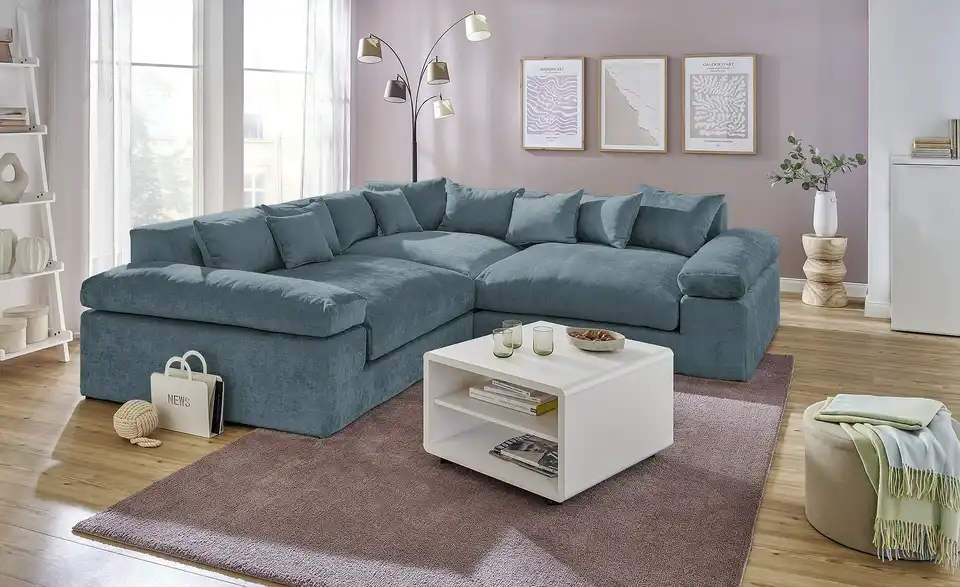 Dieses Ecksofa lädt mit seinen dicken Polsterkissen zum Entspannen ein. Zwölf Zierkissen und zwei breite Armlehnen sorgen für ein Plus an Gemütlichkeit. Machen Sie es sich bequem und fügen Sie eigene Dekodecken und -Kissen hinzu. Der einfarbige Bezug ist kombinationsfreudig und sogar auf der Rückseite des Sofas zu finden. So können Sie das Ecksofa auch mittig im Raum oder von der Wand abgerückt platzieren. Entscheiden Sie sich nur noch für Ihre Lieblingsfarbe und wählen Sie zwischen trendigem Cord, kuschelweichem Chenille-Stoff und pflegeleichtem Webstoff.Lieferung & Versand