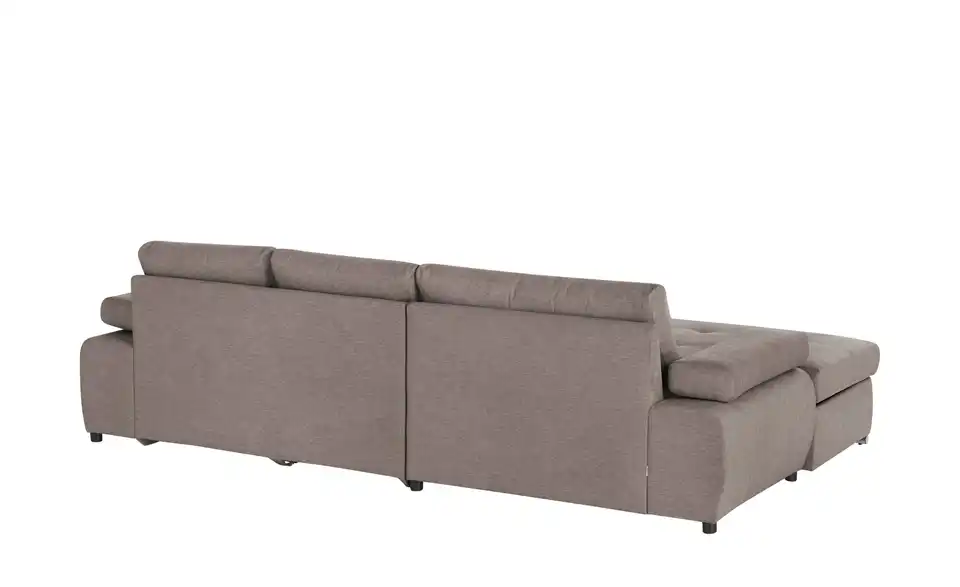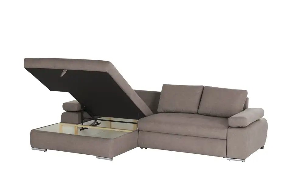 Das Ecksofa Ibby mit seiner weitläufigen L-Form bietet viel Platz zum Entspannen und Erholen. Die Sitzfläche ist mit einer Wellenunterfederung ausgestattet. Darauf befindet sich eine Polsterung aus Schaumstoff, die sich auch im Rückenbereich und den Armlehnen wiederfindet. Somit ist ein angenehmes Sitzen und Liegen gewährleistet. Für noch mehr Komfort sind drei Rückenkissen im Lieferumfang enthalten. Die Armlehnen lassen sich individuell verstellen. Ein weiteres Highlight von Ibby ist die Schlaffunktion: Ziehen Sie Ibby einfach zum Gästebett aus. Im großzügigen Bettkasten unter der Sitzfläche können Sie zum Beispiel Bettwäsche für den Besuch verstauen. Ibby ist rundum mit einem einfarbigen Stoff bezogen. So können Sie Ibby auch frei in den Wohnraum stellen. Wählen Sie aus verschiedenen strapazierfähigen Stoffbezügen und bestimmen Sie die Gestaltung Ihres Sofas ganz einfach selbst.Lieferung & Versand