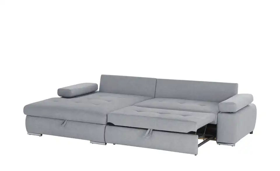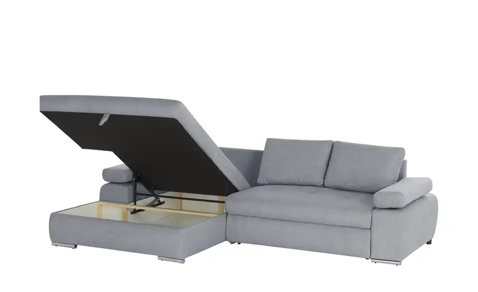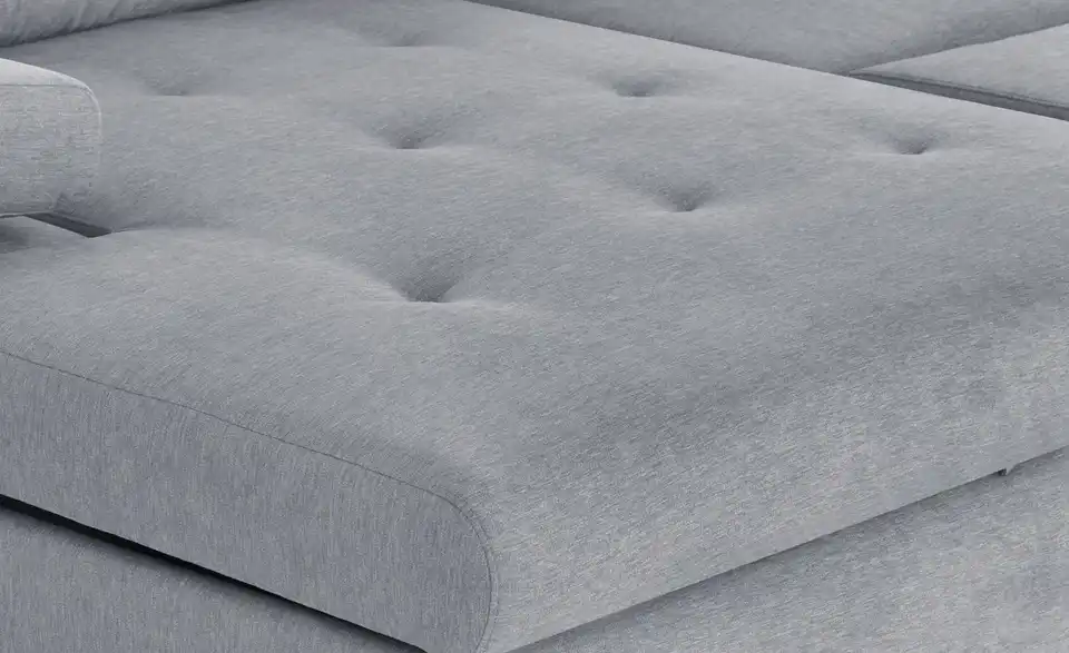 Das Ecksofa Ibby mit seiner weitläufigen L-Form bietet viel Platz zum Entspannen und Erholen. Die Sitzfläche ist mit einer Wellenunterfederung ausgestattet. Darauf befindet sich eine Polsterung aus Schaumstoff, die sich auch im Rückenbereich und den Armlehnen wiederfindet. Somit ist ein angenehmes Sitzen und Liegen gewährleistet. Für noch mehr Komfort sind drei Rückenkissen im Lieferumfang enthalten. Die Armlehnen lassen sich individuell verstellen. Ein weiteres Highlight von Ibby ist die Schlaffunktion: Ziehen Sie Ibby einfach zum Gästebett aus. Im großzügigen Bettkasten unter der Sitzfläche können Sie zum Beispiel Bettwäsche für den Besuch verstauen. Ibby ist rundum mit einem einfarbigen Stoff bezogen. So können Sie Ibby auch frei in den Wohnraum stellen. Wählen Sie aus verschiedenen strapazierfähigen Stoffbezügen und bestimmen Sie die Gestaltung Ihres Sofas ganz einfach selbst.Lieferung & Versand