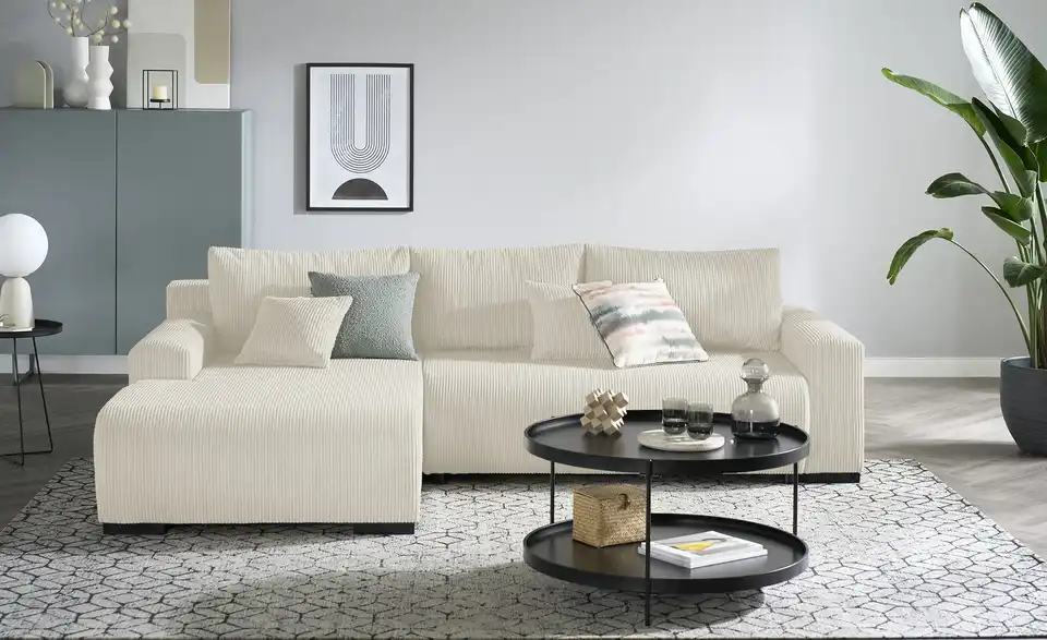 Dieses moderne Ecksofa ist mit kuschelweichem, trendigem Cordstoff bezogen. Legen Sie die Beine hoch und strecken Sie sich auf der Ottomane aus. Drei dicke Rückenkissen und zwei Zierkissen sorgen für ein Extra an Gemütlichkeit. Sie erwarten Besuch? Kein Problem. Mit nur wenigen Handgriffen entsteht eine Schlaffläche für bis zu zwei Personen. Außerdem praktisch: Im Bettkasten unter der Sitzfläche steht Ihnen Stauraum für Bettwäsche und Mehr zur Verfügung.Lieferung & Versand
