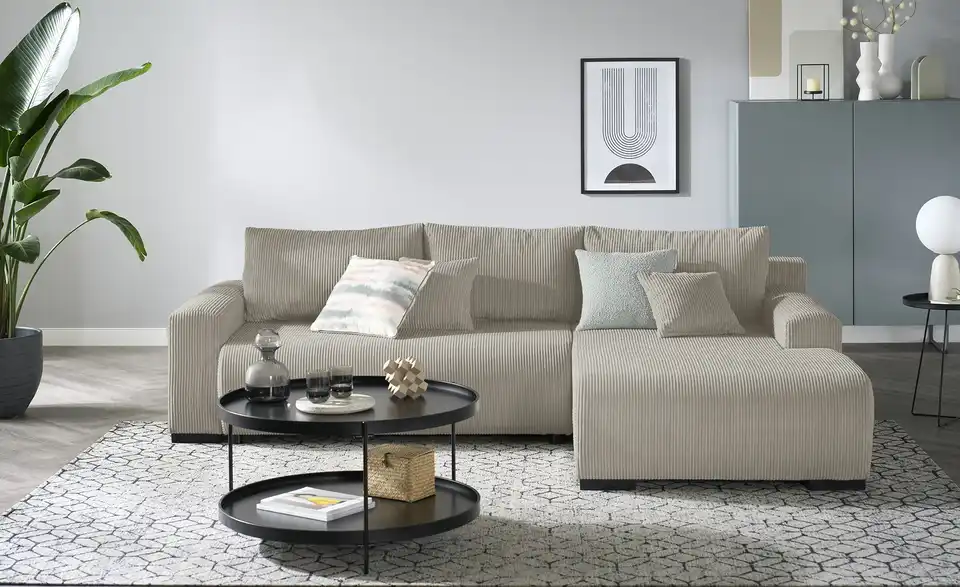 Dieses moderne Ecksofa ist mit kuschelweichem, trendigem Cordstoff bezogen. Legen Sie die Beine hoch und strecken Sie sich auf der Ottomane aus. Drei dicke Rückenkissen und zwei Zierkissen sorgen für ein Extra an Gemütlichkeit. Sie erwarten Besuch? Kein Problem. Mit nur wenigen Handgriffen entsteht eine Schlaffläche für bis zu zwei Personen. Außerdem praktisch: Im Bettkasten unter der Sitzfläche steht Ihnen Stauraum für Bettwäsche und Mehr zur Verfügung.Lieferung & Versand