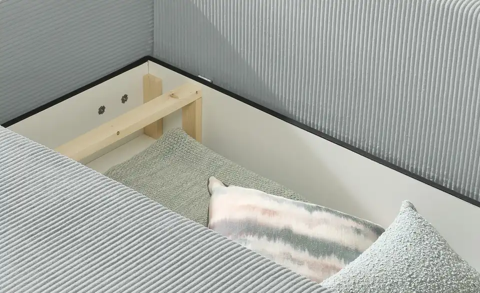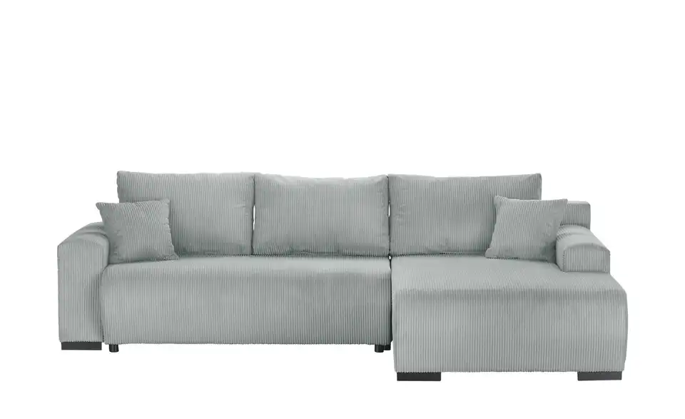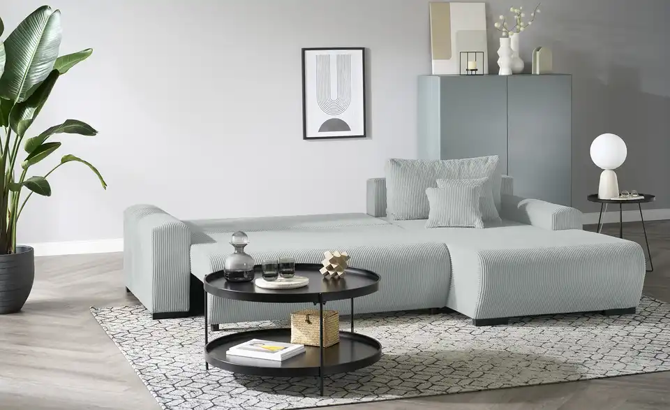 Dieses moderne Ecksofa ist mit kuschelweichem, trendigem Cordstoff bezogen. Legen Sie die Beine hoch und strecken Sie sich auf der Ottomane aus. Drei dicke Rückenkissen und zwei Zierkissen sorgen für ein Extra an Gemütlichkeit. Sie erwarten Besuch? Kein Problem. Mit nur wenigen Handgriffen entsteht eine Schlaffläche für bis zu zwei Personen. Außerdem praktisch: Im Bettkasten unter der Sitzfläche steht Ihnen Stauraum für Bettwäsche und Mehr zur Verfügung.Lieferung & Versand