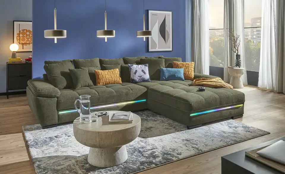 - Mehr zu Ausstattung / Funktion2 Armlehnenkissen6 Rückenkissen4 ZierkissenBeleuchtung mit Farbwechsel und Lichtlaufband über Fernbedienung steuerbar