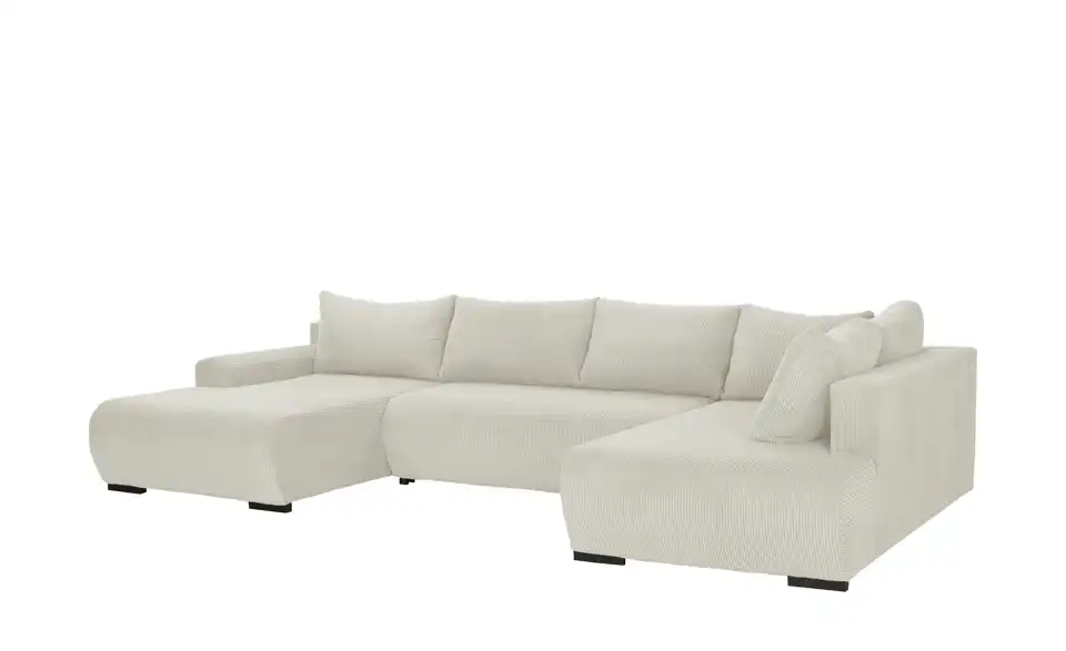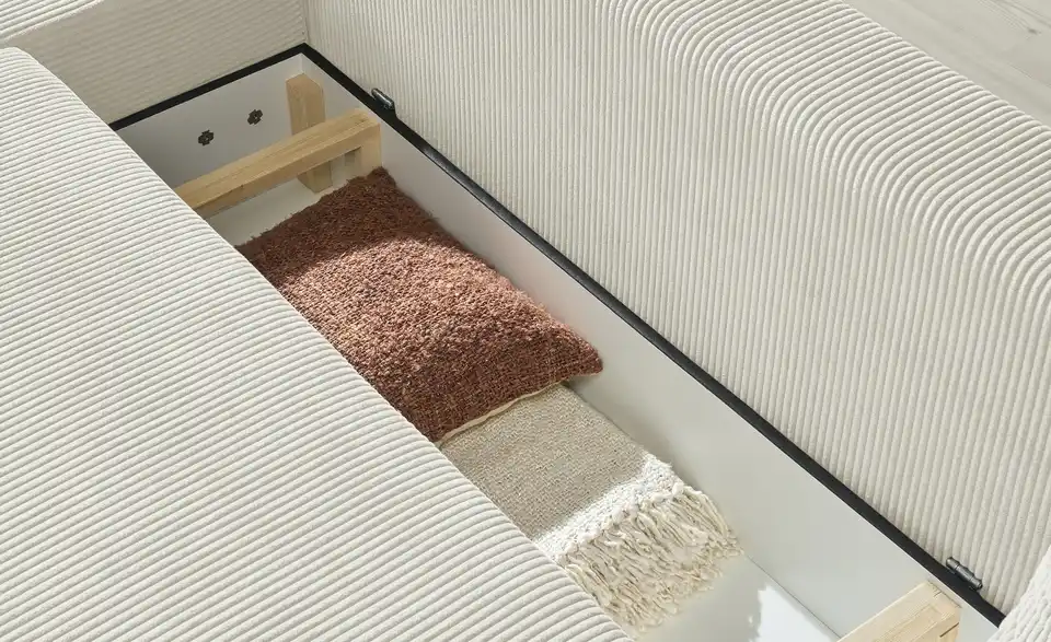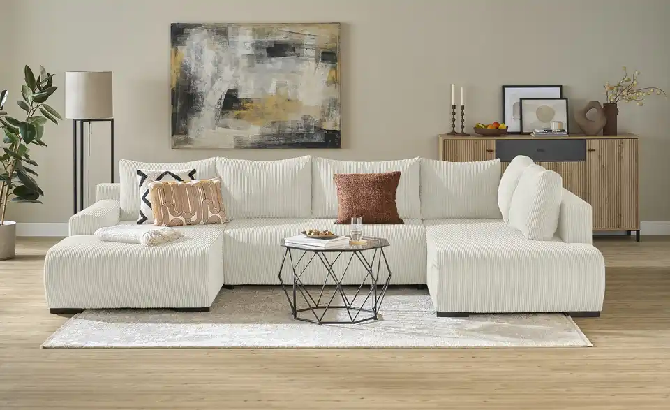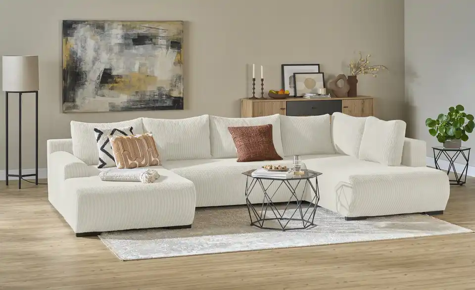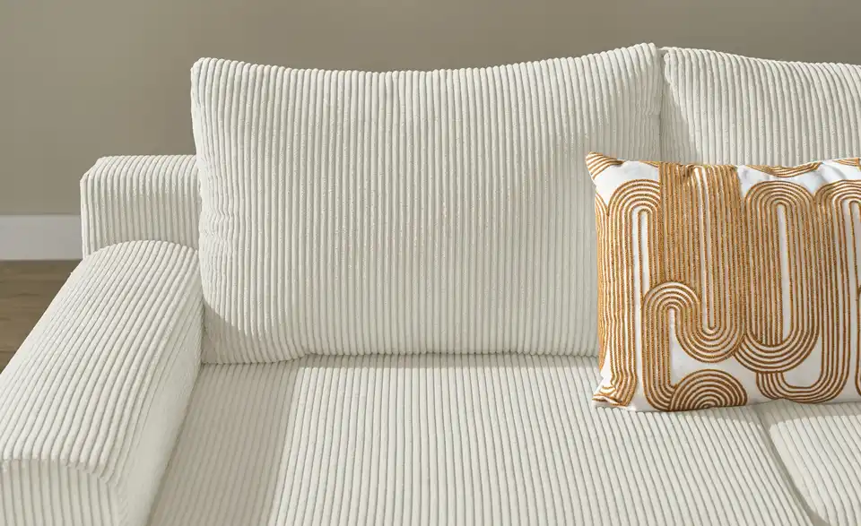 Diese moderne Wohnlandschaft ist mit kuschelweichem, trendigem Cordstoff bezogen. Legen Sie die Beine hoch und strecken Sie sich auf einer der Ottomanen aus. Sechs dicke Rückenkissen und dicke Sitzpolster sorgen für ein Extra an Gemütlichkeit. Sie erwarten Besuch? Kein Problem. Mit nur wenigen Handgriffen entsteht eine Schlaffläche für bis zu zwei Personen. Außerdem praktisch: Im Bettkasten unter der Sitzfläche steht Ihnen Stauraum für Bettwäsche und Mehr zur Verfügung.Lieferung & Versand