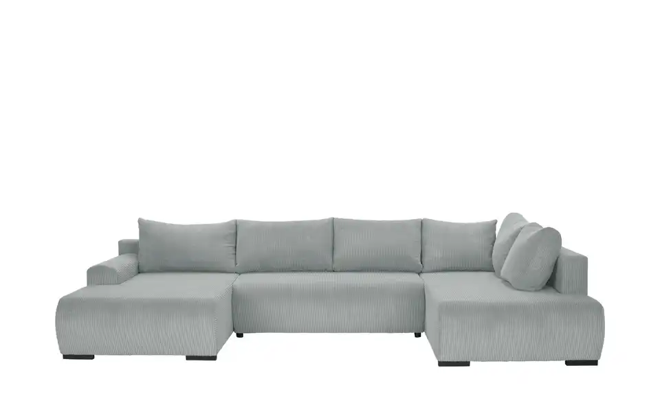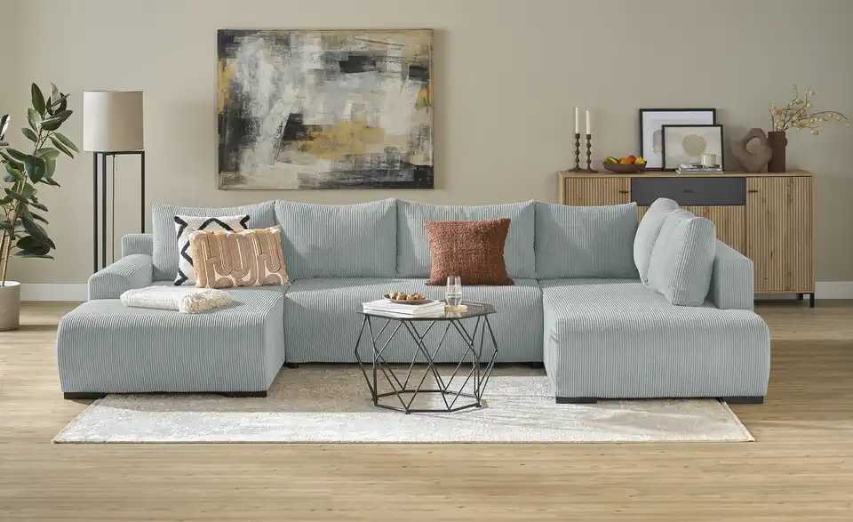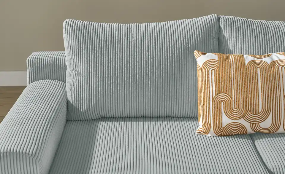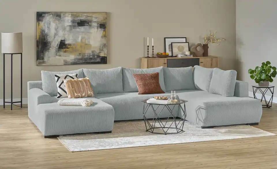 Diese moderne Wohnlandschaft ist mit kuschelweichem, trendigem Cordstoff bezogen. Legen Sie die Beine hoch und strecken Sie sich auf einer der Ottomanen aus. Sechs dicke Rückenkissen und dicke Sitzpolster sorgen für ein Extra an Gemütlichkeit. Sie erwarten Besuch? Kein Problem. Mit nur wenigen Handgriffen entsteht eine Schlaffläche für bis zu zwei Personen. Außerdem praktisch: Im Bettkasten unter der Sitzfläche steht Ihnen Stauraum für Bettwäsche und Mehr zur Verfügung.Lieferung & Versand