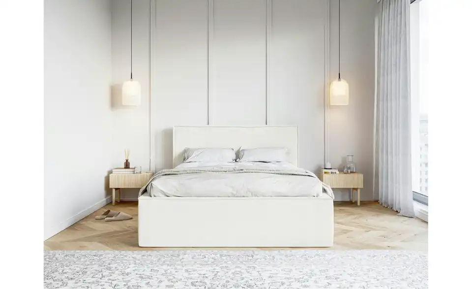 - Lieferumfang / mitgeliefertes ZubehörCremefarbenes Polsterbett mit Bettkasten 180x200 cm