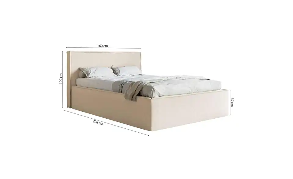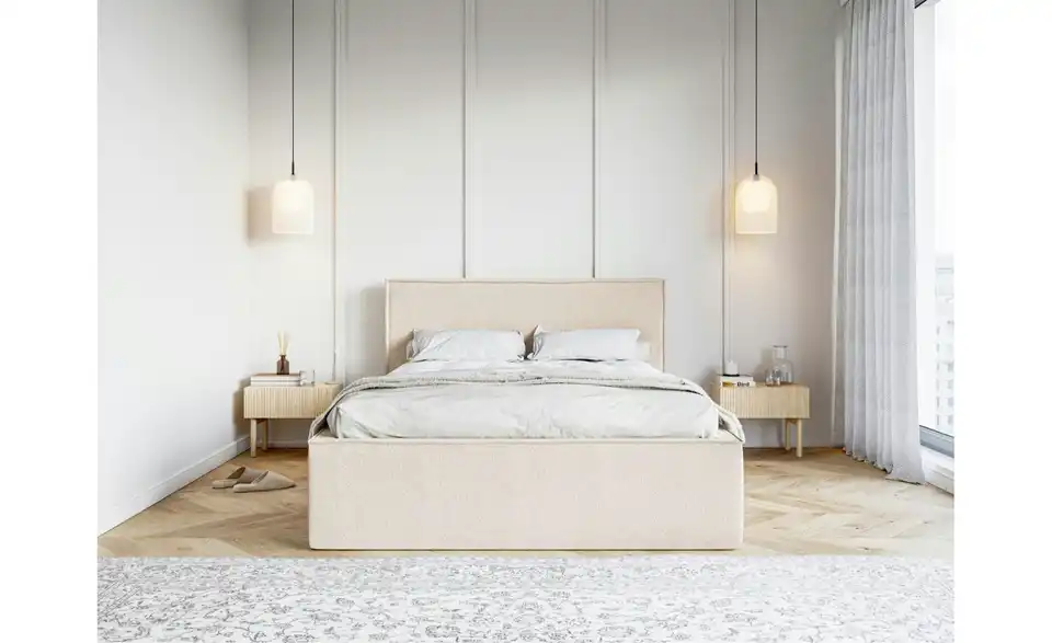 - Lieferumfang / mitgeliefertes ZubehörHellbeiges Polsterbett mit Bettkasten 140x200 cm