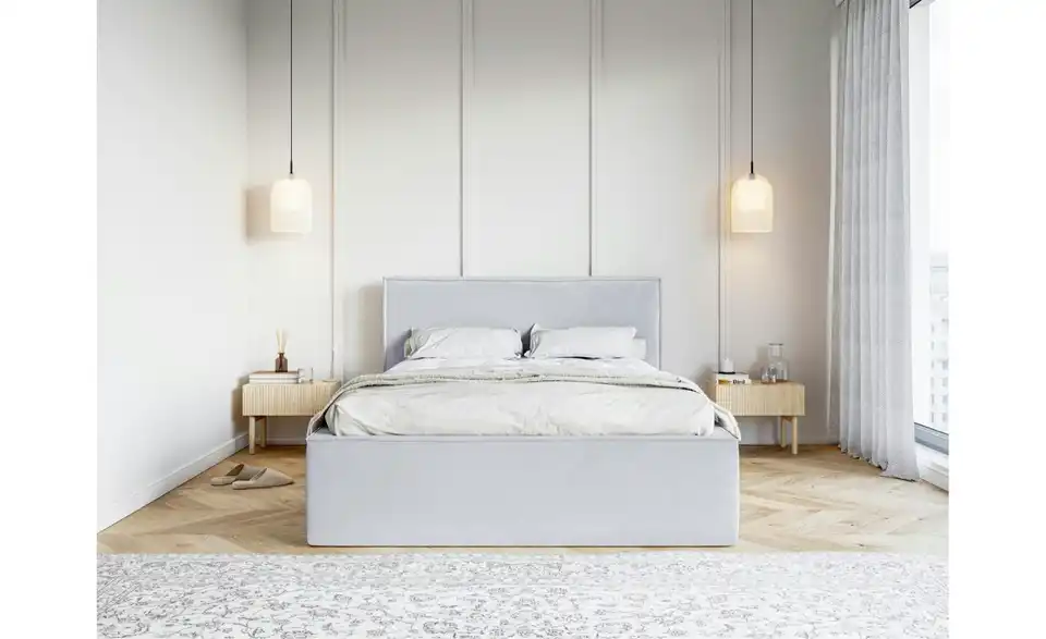 - Lieferumfang / mitgeliefertes ZubehörTaubengraues Polsterbett mit Bettkasten 180x200 cm