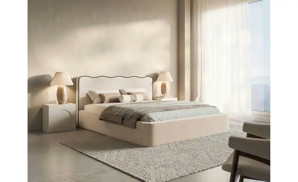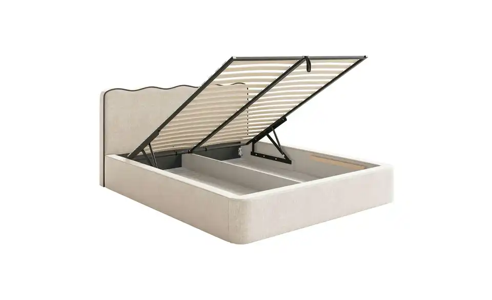 - Lieferumfang / mitgeliefertes ZubehörHellbeiges Polsterbett mit Bettkasten 160x200 cm