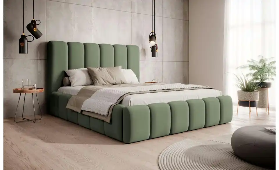 - Lieferumfang / mitgeliefertes ZubehörSalbeigrünes Polsterbett mit Bettkasten 160x200 cm