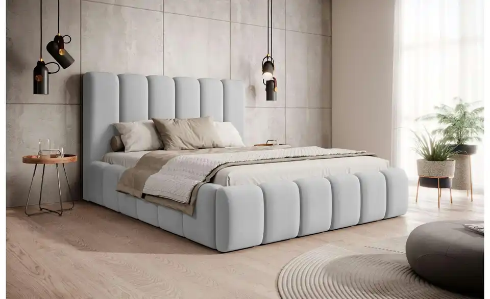 - Lieferumfang / mitgeliefertes ZubehörHellgraues Polsterbett mit Bettkasten 140x200 cm