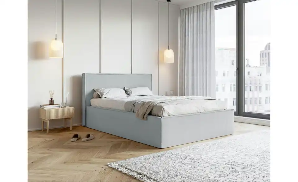 - Lieferumfang / mitgeliefertes ZubehörGraues Polsterbett mit Bettkasten 180x200 cm