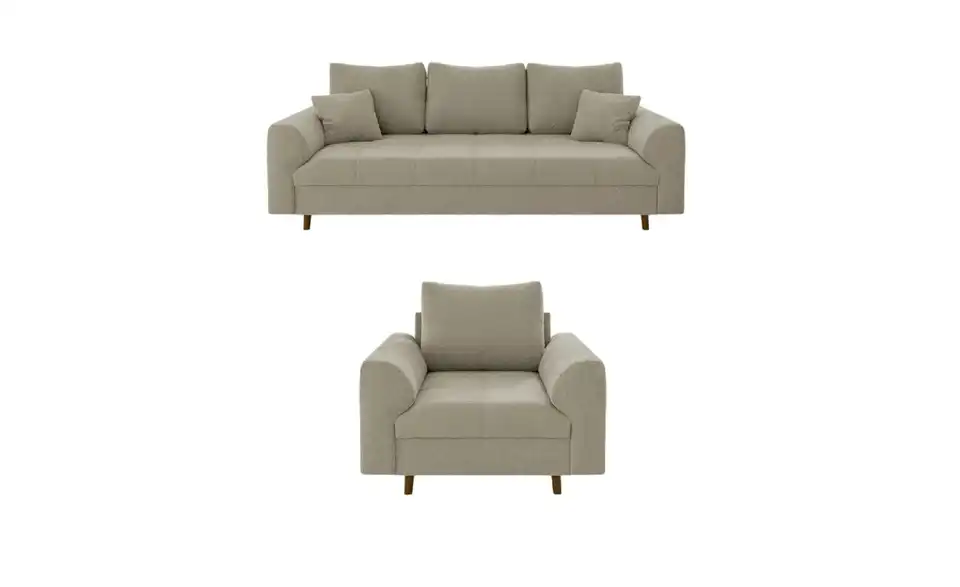 - Lieferumfang / mitgeliefertes Zubehör3-Sitzer Sofa, Sessel, Montagematerial, 2x Zierkissen