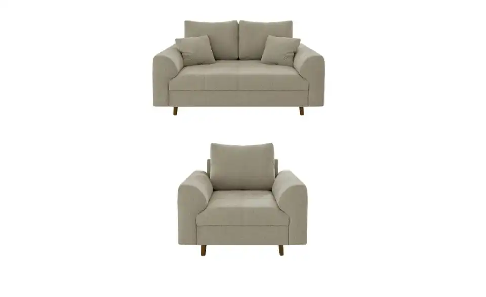 - Lieferumfang / mitgeliefertes Zubehör2-Sitzer Sofa, Sessel, Montagematerial, 2x Zierkissen