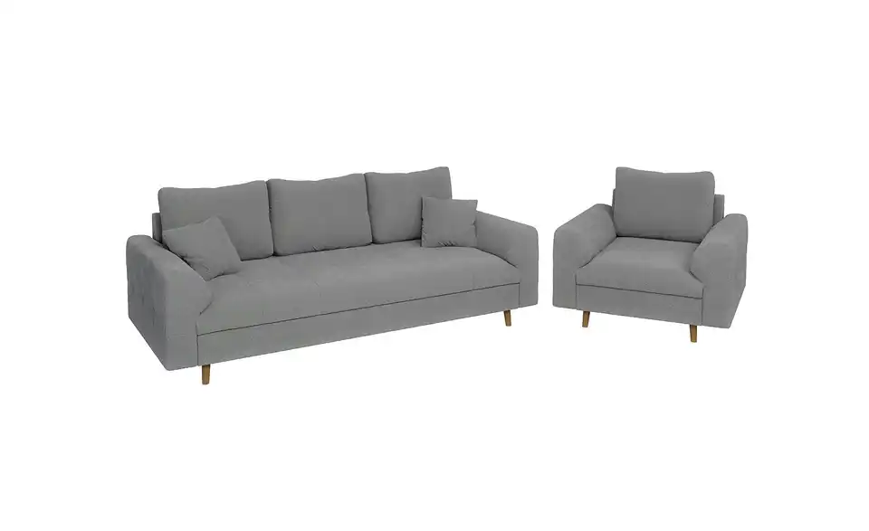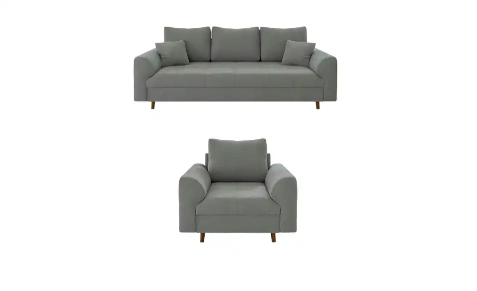 - Lieferumfang / mitgeliefertes Zubehör3-Sitzer Sofa, Sessel, Montagematerial, 2x Zierkissen