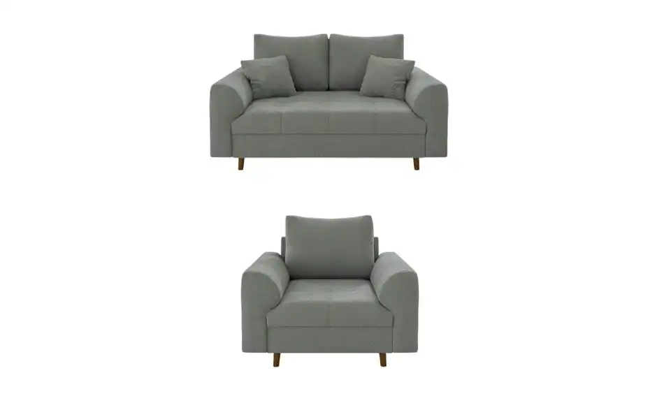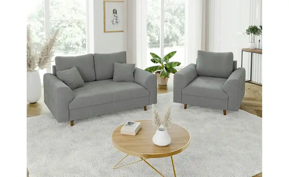 - Lieferumfang / mitgeliefertes Zubehör2-Sitzer Sofa, Sessel, Montagematerial, 2x Zierkissen