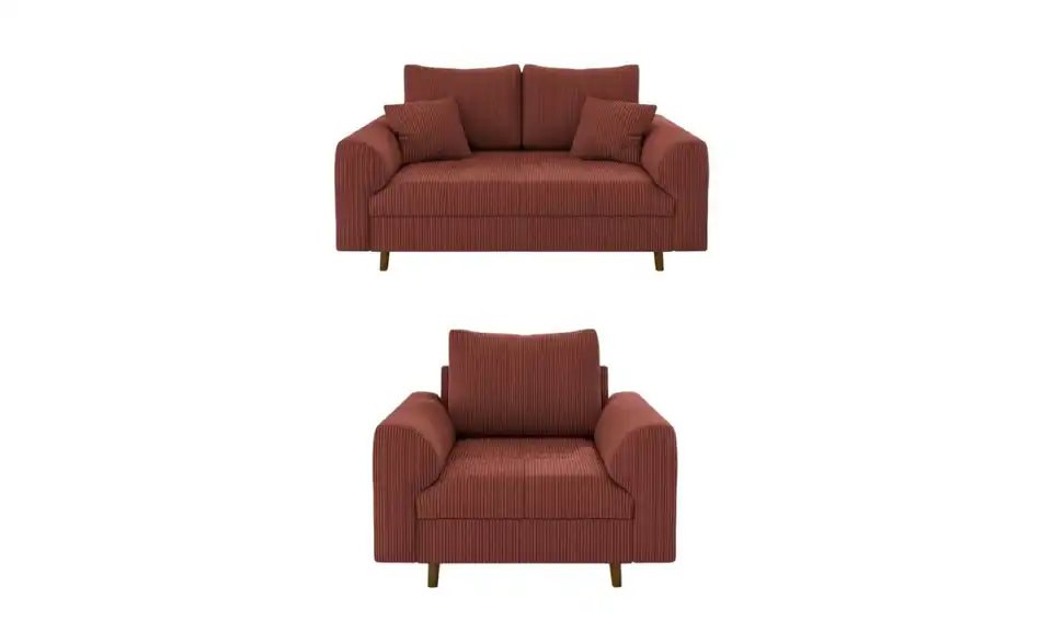- Lieferumfang / mitgeliefertes Zubehör2-Sitzer Sofa, Sessel, Montagematerial, 2x Zierkissen