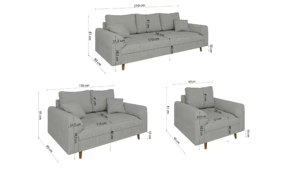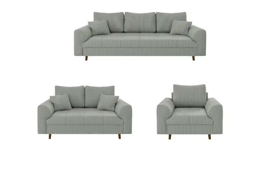 - Lieferumfang / mitgeliefertes Zubehör3-Sitzer Sofa, 2-Sitzer Sofa, Sessel, Montagematerial, 4x Zierkissen