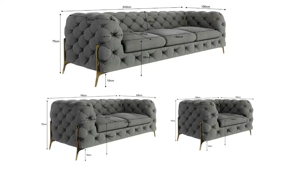 - Lieferumfang / mitgeliefertes Zubehör1 x 3-Sitzer Sofa, 1 x 2-Sitzer Sofa, Sessel, Montagematerial