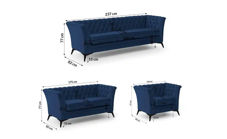 - Lieferumfang / mitgeliefertes Zubehör1 x 3-Sitzer Sofa, 1 x 2-Sitzer Sofa, Sessel, Montagematerial