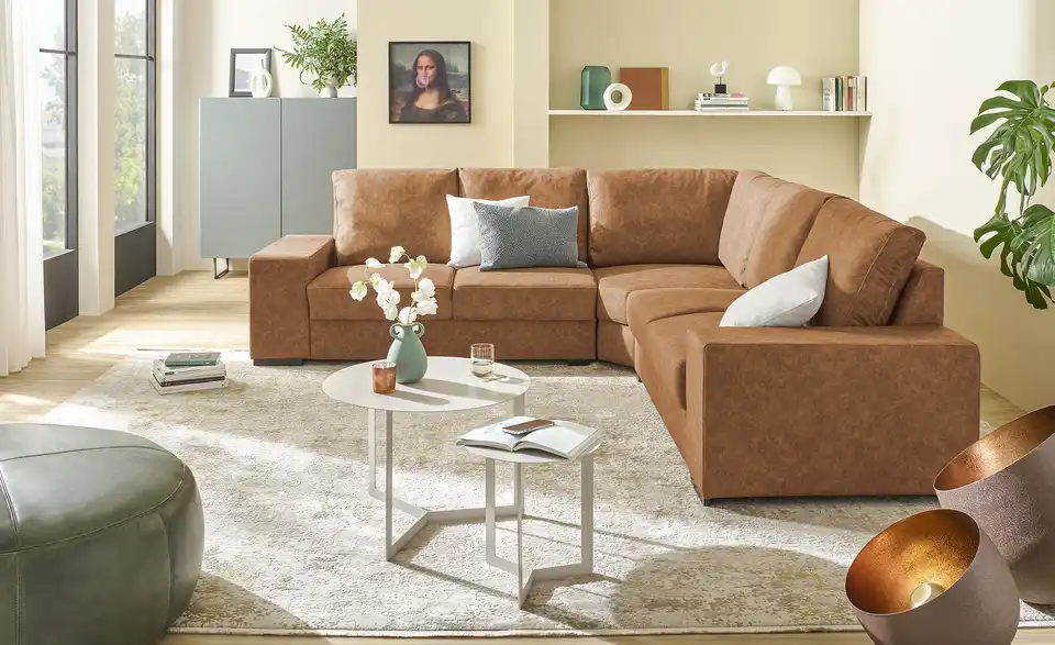Die allerbesten Voraussetzungen zum komfortablen Sitzen und Ausruhen bietet dieses Ecksofa. Das Modell Renée lässt sich dank des echt bezogenen Rückens frei im Raum platzieren und hat eine bequeme Polsterung aus Schaumstoff für das maximale Wohlfühlerlebnis. Das Gestell aus Massivholz ist die Basis des Sitzmöbels. Das Sofa begeistert mit Rückenkissen als Zubehör. Diese Couch wird ganz schnell zu einer wahren Oase der Gemütlichkeit, welche Ihrem Zuhause auf praktische und attraktive Art und Weise den letzten Schliff verleiht.Lieferung & Versand